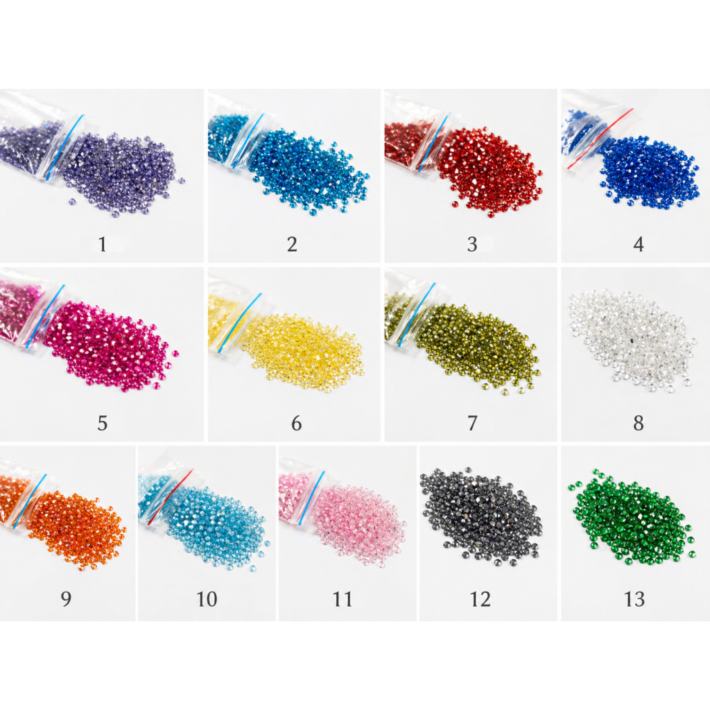 Můžete si vybrat z široké škály odstínů (křišťálová, růžová, žlutá, zelená, modrá, fialová a další) a určit pořadí, v jakém mají být zirkony v designu umístěny.