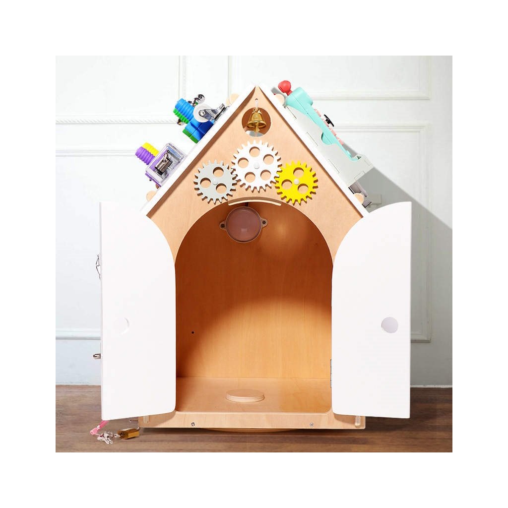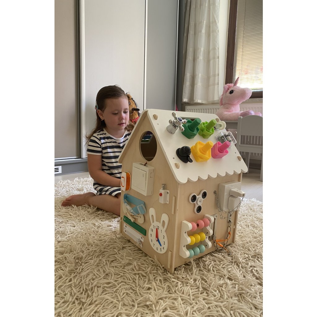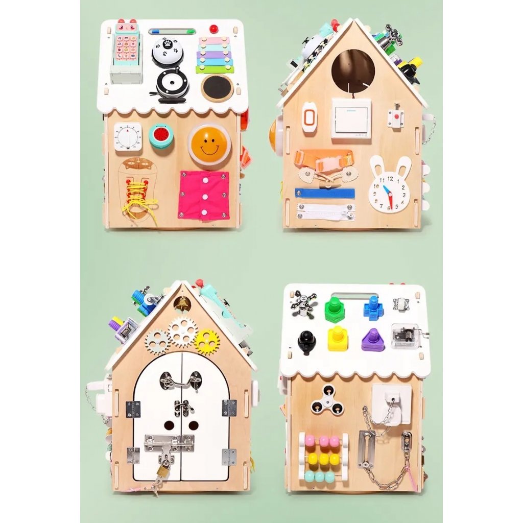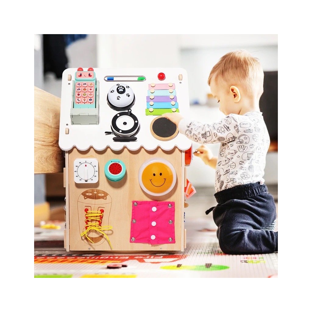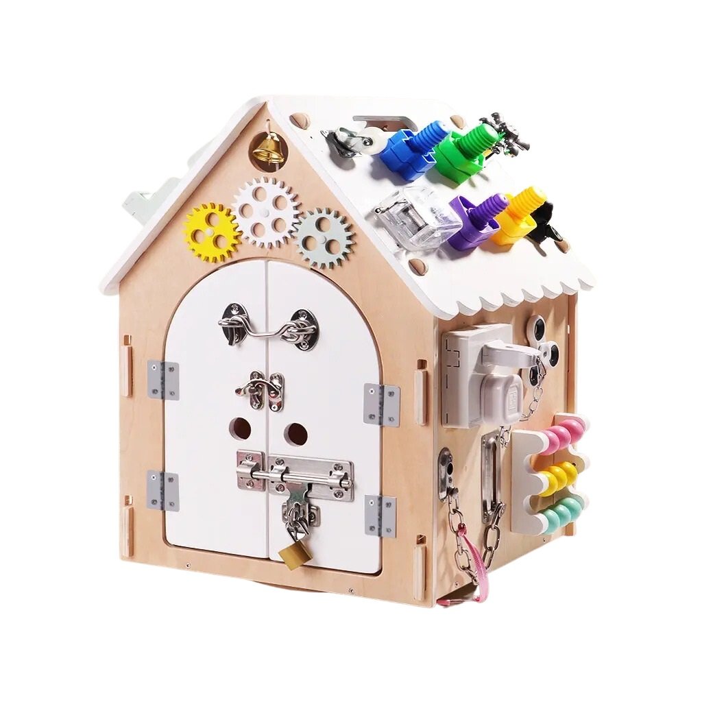 Drevený activity board domček je hračkou aj výukovou pomôckou. Pri hre deti prirodzeným spôsobom zdokonaľujú svoje zručnosti, učia sa novým a užijú si veľa zábavy.