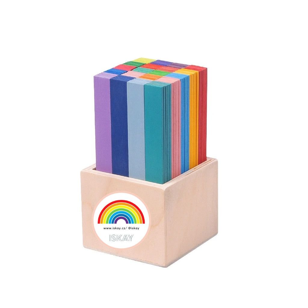 100 dílků dřevěné barevné stavebnice, dílky o rozměrech: 18 × 2 × 0,3 cm